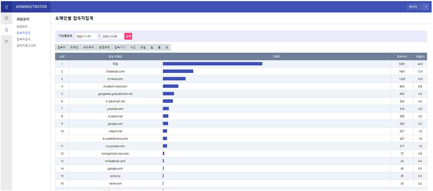 자체 유입분석프로그램으로 매체별 유입분포도체크와